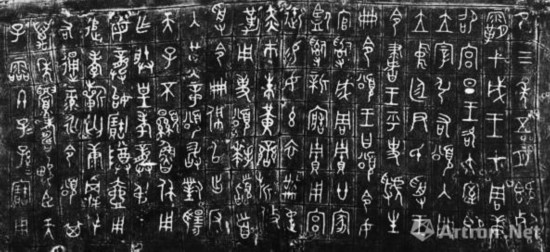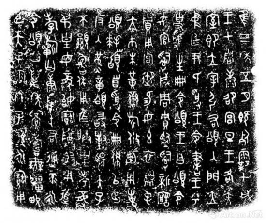 “三颂”金文工整秀丽、典雅规范,书体遒劲、雄肆奇美。无论上下左右,成列成行,布局整齐,书体规范,大小均匀,笔画粗细一致,起笔停笔不露锋芒,笔画转折处作圆弧形,都是西周后期的风格,它和商代晚期到西周前期那种字的大小常不相同、起笔收笔多尖锐出锋、笔画转折处多作方折的所谓波磔体的青铜器铭文有了明显的区别?!叭獭蓖髅募仁俏髦芡砥诮鹞淖畛墒斓男翁?,又是书法艺术的杰作,为西周王室所使用的标准书体,被后世称为临习金文的最理想的范本之一。