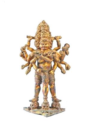 明万历丁巳年(1617年),丽江土知府木增为母求寿,表祝国诚心,向朝廷奏准在鸡足山建祝国悉昙禅寺。得到万历皇帝御制赐画?;嬷醒牖嬗泻焐砻芗鸶眨吲?,三头六臂,赤裸上身,戴有骷髅头冠和项圈,手持各种法器?;孀笊辖歉怯忻鞔诟卣隆肮阍酥Α逼渖夏适椤按竺魍蚶甏味∷饶昙眨啤?,其旁题写金字“祝国悉昙禅寺随藏供养”。此作品融合了汉藏艺术风格,见证了明代晚期的央地关系,十分珍贵。