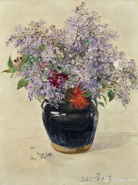 早在二十世纪六十年代时,吴冠中便已经逐渐形成了自己的油画风格。这一时期,他仍然在西方绘画的写生技巧和中国画的写意性之间进行探索,作品偏于写实,而此幅《花卉》无疑具有这一阶段的典型风格。