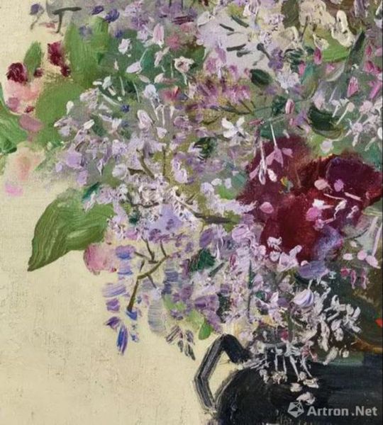 由于整体色调较淡,因此对于花卉层次细节与画面空间关系的表现上颇具难度。为此,画家运用了类似于夏尔丹的厚涂法,用松散的笔触反复涂抹,层层递进。前后花卉看似相似,其实色差有别,姿态各异,从而形成一种视觉厚度和假想中的空间。纵观全幅,沉稳素雅,笔触奔放流动却又内敛平稳,造型上摒弃了大量不必要的繁缛细节从而使视觉重心集中在花卉上。画家用平实的光与色赋予这瓶普通的花卉一种庄严静穆的美感,以及某种隐含于静默中的生命力量。