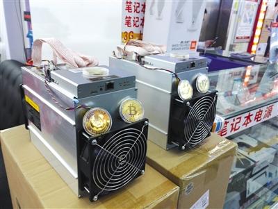 5月4日,深圳华强北赛格电子市场一家档口展示的数字货币矿机和比特币模型。