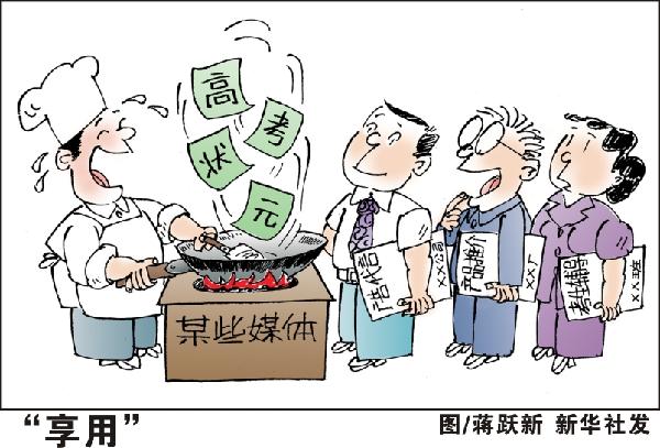 尽管多年前教育部就明确要求禁止炒作“高考状元”,各高校禁止对新生成绩进行排名,但每到高考高招期间,“高考状元”总会成为最引人关注的话题,各种高考成绩排行榜层出不穷,并且其炒作有愈演愈烈之势,这种炒作已经影响甚至是误导了公众的教育价值观,强化了应试之风,恶化了教育改革与发展的社会环境。