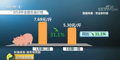 根据农业农村部对全国500个集贸市场的监测,全国生猪价格从2018年1月第二周每斤7.69元,连续下跌16周,5月第一周每斤是5.3元,累计跌了31.1%,同比跌了31.1%,猪粮比价已经跌破成本线,生猪养殖开始出现全面亏损。
