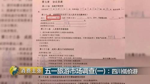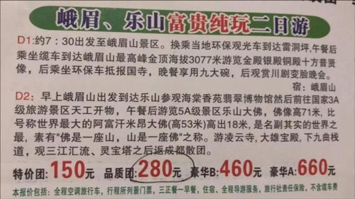 而另一些旅行社则更加肆无忌惮。一家名为国旅四川国际旅行社的门店里,峨眉、乐山两日游的报价是每人200元,记者交完钱后,他们直接把这个价格写进了旅游合同。