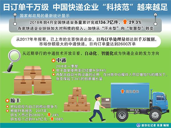 图表:日订单千万级 中国快递企业“科技范”越来越足 新华社记者 肖潇 编制