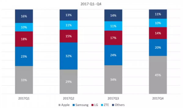 根据调研机构counterpoint的数据,2017年,中兴牢牢地占据了美国智能手机市场第四名的位置,市场份额仅次于苹果、三星和LG。