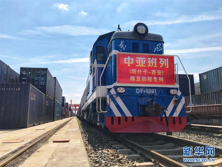 从塔什干出发、载有乌兹别克斯坦绿豆的中亚班列驶抵西安新筑车站(5月11日摄)新华社发(庄敬平 摄)