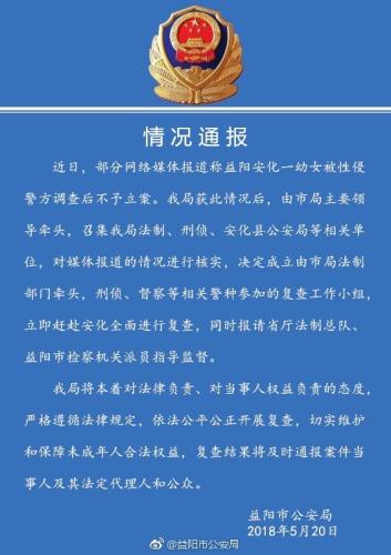 通报称,近日,部分网络媒体报道称益阳安化一幼女被性侵警方调查后不予立案。益阳市公安局获此情况后,由益阳市局主要领导牵头,召集益阳市公安局法制、刑侦、安化县公安局等相关单位,对媒体报道的情况进行核实,决定成立由市局法制部门牵头,刑侦、督察等相关警种参加的复查工作小组,立即赶赴安化全面进行复查,同时报请省厅法制总队、益阳市检察机关派员指导监督。复查结果将及时通报给公众。