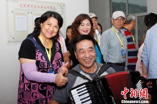 在延南街道淮海社区,由社区退休老人组成的枫漫民乐团正在演奏山西民歌,吸引了台湾同胞音乐爱好者,纷纷与社区居民面对面的交流音乐。