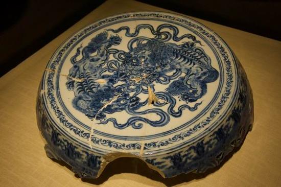 再如:2014年景德镇明清御窑遗址出土的六件青花大花盆,外壁绘有云龙纹、海兽、麒麟等,体型硕大,颇有气势,即使在明代御窑瓷器烧造取得最高成就的永乐、宣德时期也未见有类似作品。另有同期出土的纹饰各异的青花大绣墩残片,在明代御窑瓷器中也堪称绝无仅有。青花绣墩座面上分别描绘双狮戏球、方胜飘带、松竹梅等纹饰。绣墩亦称凉凳,传世品中明代瓷绣墩多为正德、嘉靖、万历朝作品,正德朝以前的非常罕见。