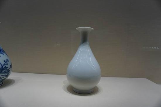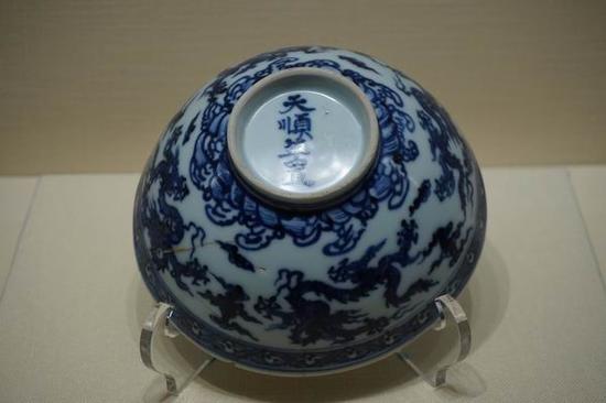 展品中还有借自武汉博物馆的“天顺年置”铭青花云龙纹碗,此碗2007年出土于湖北省武汉市江夏区流芳岭明代王室家族墓地。正统、景泰、天顺三朝瓷器均不署正规年款,这件青花碗出土信息明确,所署纪年款虽非正规年款,但仍可被视作天顺御窑瓷器断代的标准器,具有重要的学术价值。