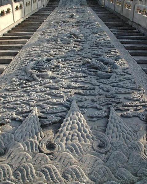 故宫里的石头也是有故事的石头。故宫里最大的丹陛石在保和殿后,它是在明代时由一块完整的石头雕刻而成。据历史记载,故宫的石头大都来自于北京西南郊房山的大石窝和门头沟的青白口。这里从明清两代跨越600年,直到现在还在生产汉白玉石头。保和殿后巨大的石料光是开采就动用了一万六千多人,运往京城时则动用数万名民工,在运送石料的道路两旁,修路填坑。每隔一里左右掘一口井,在隆冬严寒滴水成冰的日子,从井里汲水泼成冰道。二万民工一千多头骡子,用了二十八天时间才运到京城。这块巨石上雕九条腾飞的巨龙,出没于流云之间,石雕的周围刻有精美大花纹,固称“云龙阶石”。