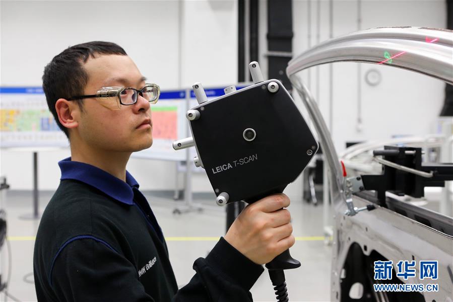 在沈阳华晨宝马大东工厂车身车间,工人用激光扫描设备对车身进行检测(2017年5月9日摄)。新华社发