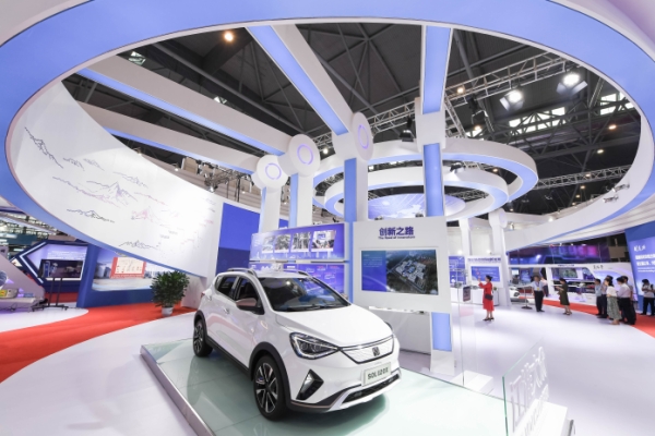 在2018世界制造业大会上,江淮大众汽车有限公司推出的首款车型SOL(思皓)E20X亮相(5月25日摄)。新华社记者 张端 摄