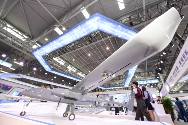 在2018世界制造业大会上,一款可应用于农业、林业和大型水利等领域的固定翼无人机亮相(5月25日摄)。新华社记者 张端 摄