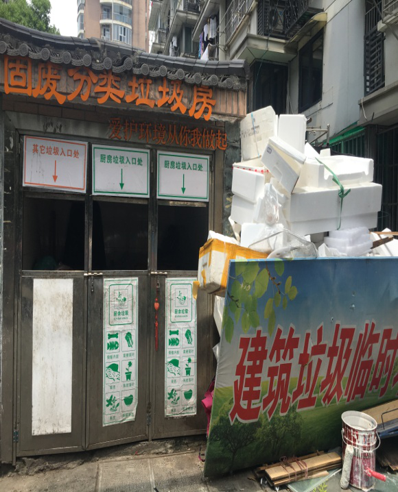 小区内垃圾分类总体情况较好,有固定垃圾房,分类清晰,标识明显;有大件垃圾临时堆放点、垃圾分拣点、宣传海报等,垃圾箱外较为整洁,无多余垃圾散落在地面。在对小区居民的访谈过程中,居民们也表示社区已对居民进行过生活垃圾分类的培训和宣传,每周二还能到社区去领用免费垃圾袋。大部分居民能够做到按规定分类垃圾。由于外来务工租客流动频繁,小区还未能完全做到垃圾四分法。个别小区大型垃圾过多,需要及时清理。