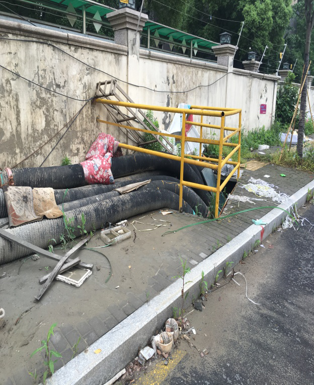 保亭村施工场地由于还未交付,属于无人管理状态,建筑工地外道路上垃圾较多,积水严重,共享单车扎堆凌乱停放,对环境造成影响。