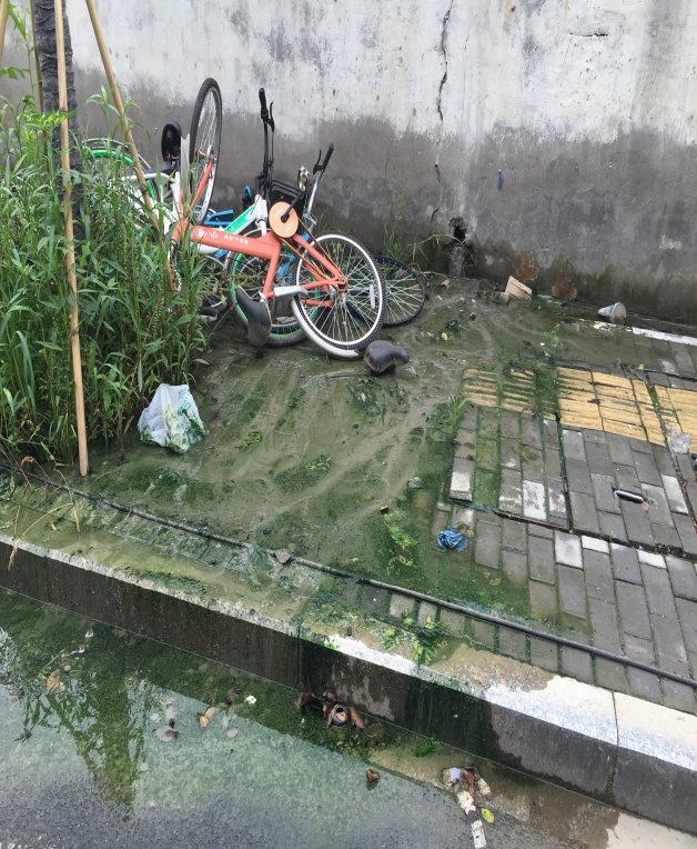 路边积水严重,长满青苔