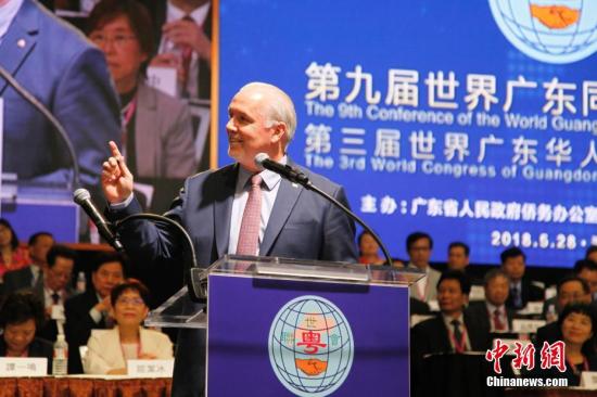 当地时间5月28日,加拿大不列颠哥伦比亚?。ㄓ忠氡笆。┦〕ず亟鳎↗ohnHorgan)在温哥华举行的第九届世界广东同乡联谊大会(简称“世粤联会”)暨第三届世界广东华人华侨青年大会开幕式上致辞。。中新社记者 余瑞冬 摄
