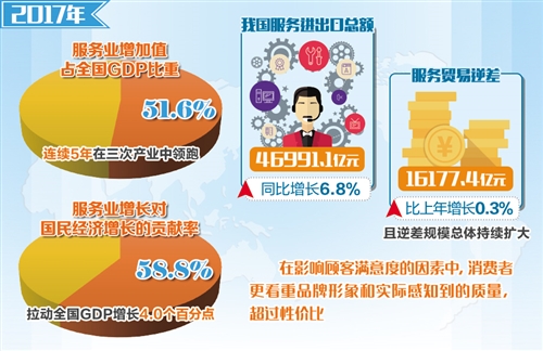 服务业是现代化经济体系建设的关键领域。统计数据显示,2017年,服务业增加值占全国GDP比重为51.6%,连续5年在三次产业中领跑,服务业增长对国民经济增长的贡献率为58.8%,拉动全国GDP增长4.0个百分点。