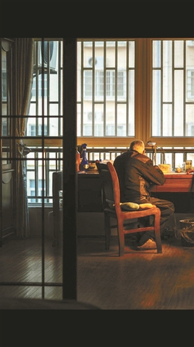 但更多时候,赵康民会在书房写书稿。这个只有十多平方米的书房,陈设简单。满眼望去,是占据了一面墙的书柜,和一个靠窗的整洁书桌。平时,赵康民在这个书桌前伏案写作。在无数个日夜里,他写下一本本书稿。一笔一画,每一页的字迹都端正、遒劲。