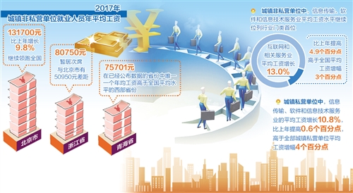 2017年,在城镇非私营单位中,信息传输、软件和信息技术服务业平均工资水平继续位列行业门类首位,其中互联网和相关服务业平均工资增长13.0%,比上年提高4.9个百分点,高于全国平均工资增幅3个百分点。在城镇私营单位中,信息传输、软件和信息技术服务业的平均工资增长10.8%,比上年提高0.6个百分点,高于全部城镇私营单位平均工资增幅4个百分点。