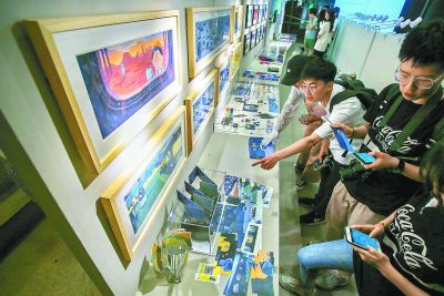 “想不到可以一边看展一边‘扫货’,学生们为作品配套设计的小周边很有个性?!焙壬壅购蠊郝蛄艘徽趴ㄌ?,上面憨态可掬的小动物正骑着摩托车。这是城市设计学院毕业生吕莎莎为作品《放学了》创作的衍生品。