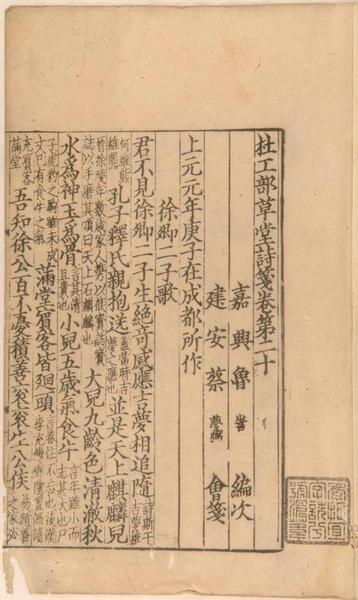 《杜工部草堂诗笺》五十卷,宋代蔡梦弼所撰,宋建刻本,存一册,为卷二十至二十一,共二卷,钤有“季振宜字诜兮号沧苇”印,为清初藏书家季振宜旧藏品。此本中国国家图书馆藏有一部,存三十九卷(一至十九、二十二至三十五、三十九至四十一、四十八至五十),也有“季振宜字诜兮号沧苇”印,由此可知,上图藏此册原与国图藏本为同一部,在流传中分离二处。此为南宋宁宗嘉泰元年(1201)成书后建阳第一刻本,刊刻精美。