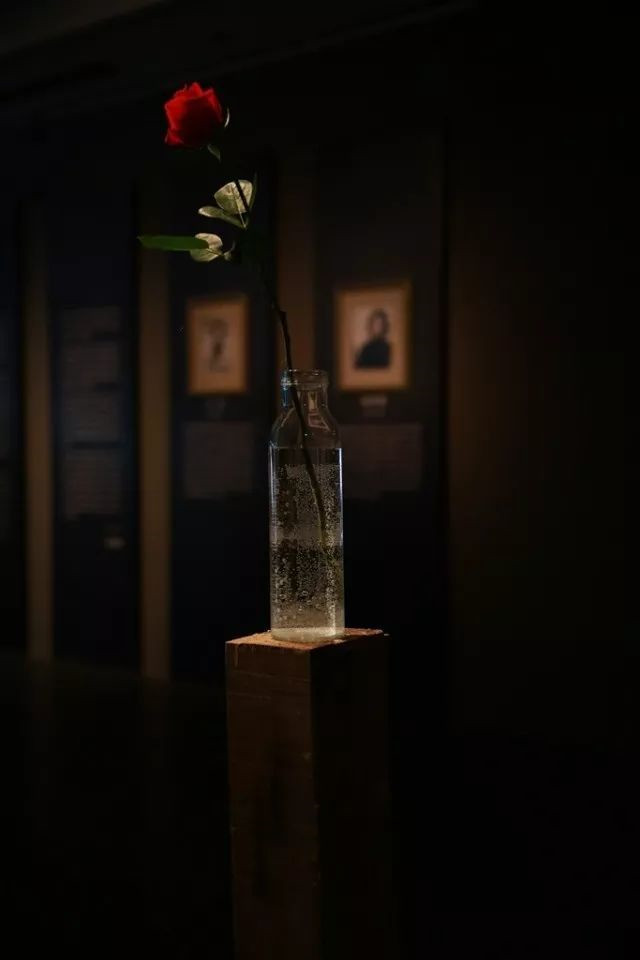 展厅正中间摆放的一支红玫瑰点亮了整个展览的暗沉,也让展览从“悲歌”落到了“大爱”上。“我们当时讨论这个展览全是黑色,观众是受不了的。我想起《辛德勒的名单》中有一幕,一个穿着红色裙子的小姑娘在一群德国士兵中间一闪而过,于是决定放一支红玫瑰?!蔽夂榱了?为了那一支玫瑰花怎么放,团队又花了很多时间讨论,光是花瓶就买了三回,“最后我回家拆了我太太收藏的一件美国艺术家的装置作品,因为那个瓶子特别合适。玫瑰也是要求每天都必须新鲜。”