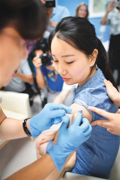 图为中国内地第一针九价HPV疫苗进行接种。新华社记者 郭 程摄