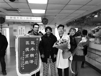 3月5日,河南省新乡市中心医院肿瘤一科,康复患者和家属正手捧鲜花和锦旗,送给九三学社社员、副主任医师侯夏宝?!叭镏氐姆沃琢霭?,多么大的一个恶魔!多亏了侯大夫,我才能够把它赶得远远的!”想起这个艰难的战争过程,患者的眼里全是泪花。