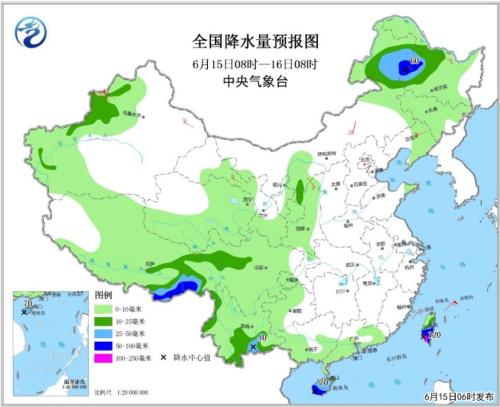6月15日08时至16日08时,海南岛、台湾岛、西藏东部、川西高原、云南东部和南部、新疆北部、内蒙古东部、黑龙江西部等地有中到大雨,海南岛、台湾岛、西藏东南部、黑龙江西部内蒙古东部局地有暴雨(50~90毫米),上述局地将伴有短时强降水、雷暴大风或冰雹等强对流天气。新疆北部、内蒙古中部、东北地区等地的部分地区有4-6级风,新疆西部山口风力有7-8级。东海南部、台湾海峡、南海东北部将有7~8级、阵风9级大风。