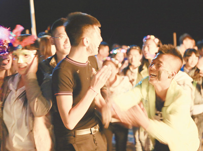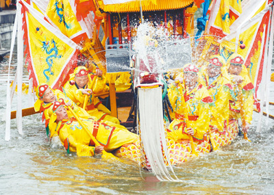 闽台对渡文化节暨蚶江海上泼水节上,人们互相泼水嬉闹。