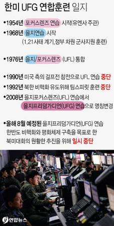 韩联社称,韩美首次中断联合军演发生在1990年。在当时全球性的“脱冷战”氛围中,朝韩商定于1990年9月举行首次朝韩总理会谈。为营造对话氛围,韩美中断了原定于8月举行的代号“乙支焦镜(UFL)”的联合军演。当时因海湾战争之故,美国没有余力参加联合军演。