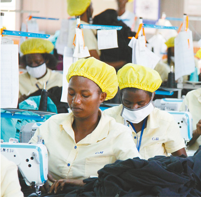 卢旺达基加利一家中国投资的服装厂中,当地青年正在工作