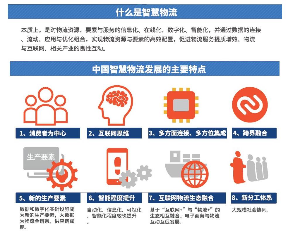 魏际刚:智慧物流的本质,是对物流资源、要素与服务的信息化、在线化、数字化、智能化,并通过数据的连接、流动、应用与优化组合,实现物流资源与要素的高效配置,促进物流服务提质增效、物流与互联网、相关产业的良性互动。智慧物流主要呈现以下特点:一是以消费者为中心;二是互联网思维、平台思维(开放、共享、共赢)、创新思维;三是多方面连接(市场主体连接、信息连接、设施连接、供需对接等)、多方位集成;四是跨界融合;五是数据和数字化基础设施成为新的生产要素,大数据为物流全链条、供应链赋能,成为物流企业新竞争力的关键来源;六是自动化、信息化、可视化、智能化程度较快提升;七是基于“互联网+”与“物流+”的生态相互融合,电子商务与物流互动互促发展;八是新分工体系,大规模社会协同。