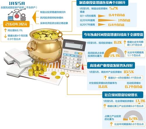 国家统计局近日发布的数据显示,今年前5个月,我国制造业投资增长5.2%,比前4个月提高0.4个百分点,连续两个月出现回升势头。