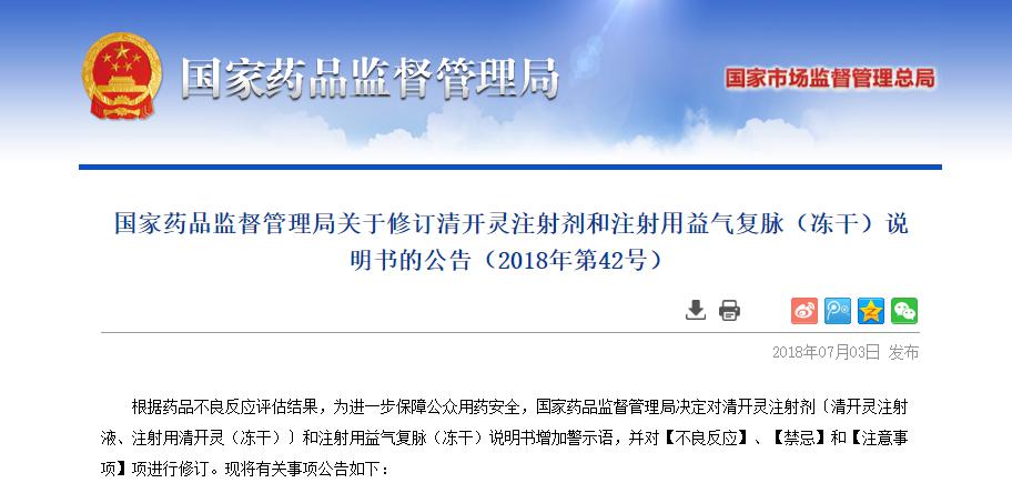 药监局:清开灵注射剂禁用于新生儿、婴幼儿、孕妇