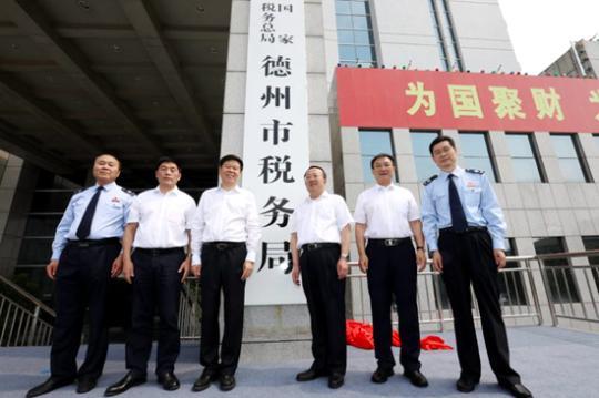 税务总局党组书记、局长王军与山东省副省长于国安共同为国家税务总局德州市税务局揭牌