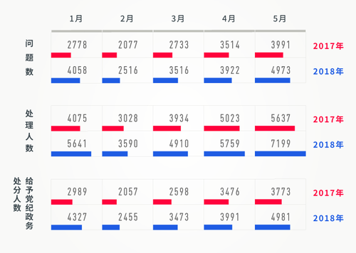仔细梳理发现,今年1-5月,每月全国查处违反中央八项规定精神问题数、处理人数、给予党纪政务处分人数相比去年同期均大幅上升。此外,除2月有下降外,1-5月的各项数据呈逐月攀升趋势。
