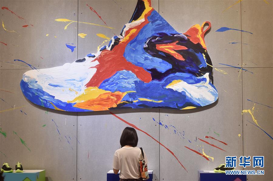 在一年一度的中国(晋江)国际鞋业暨国际体育产业博览会上,一位客商在了解安踏运动鞋(2017年4月18日摄)。新华社记者 宋为伟 摄