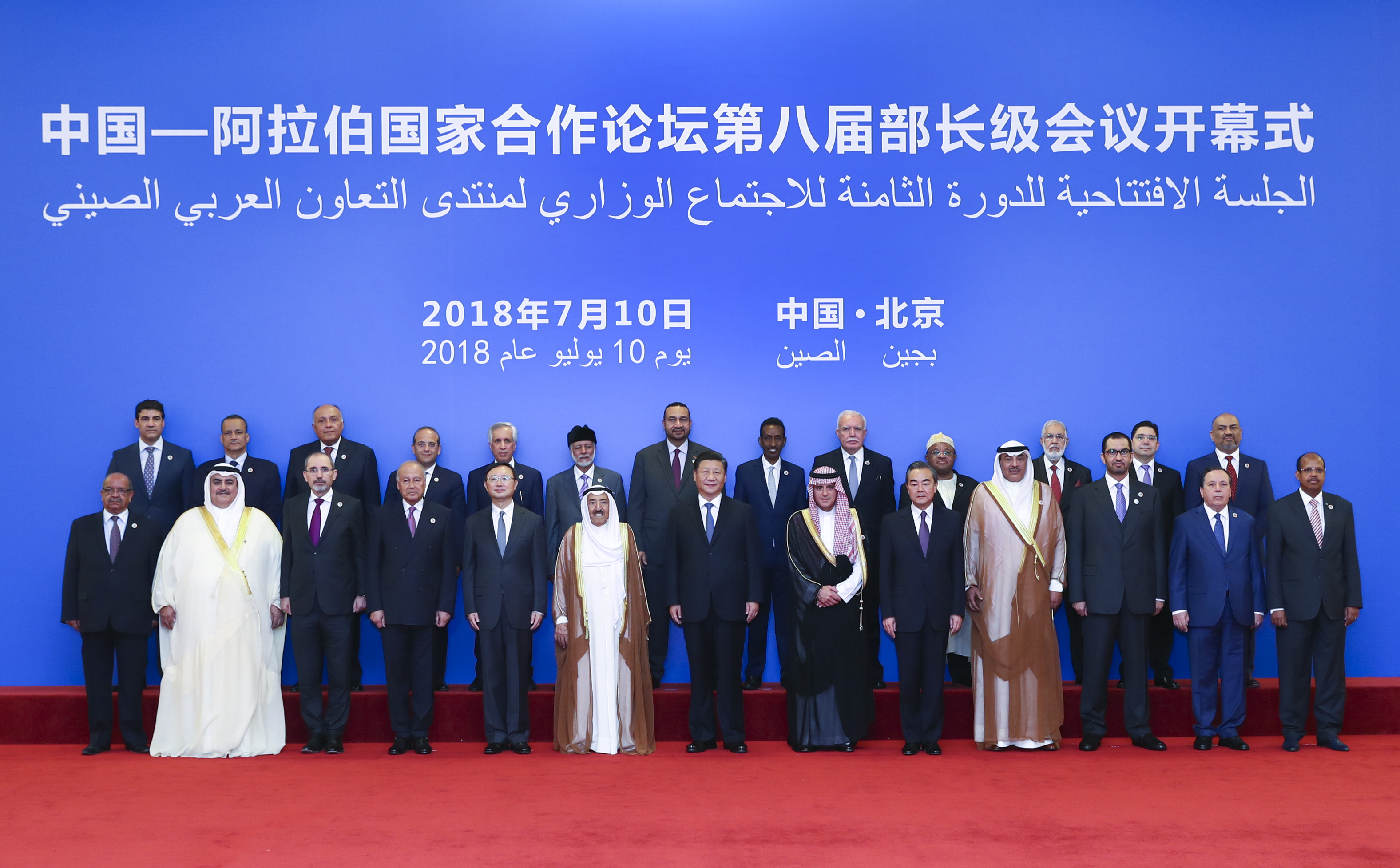 7月10日,中阿合作论坛第八届部长级会议在北京人民大会堂开幕。国家主席习近平出席开幕式并发表题为《携手推进新时代中阿战略伙伴关系》的重要讲话。这是开幕式前,习近平同科威特埃米尔萨巴赫及出席会议的各国代表团团长合影。新华社记者 谢环驰 摄