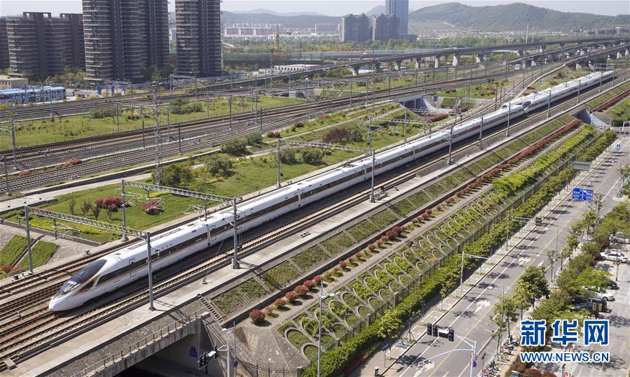 一列“复兴号”动车组列车行驶在京沪高铁南京市境内(4月9日摄)。新华社发(苏阳 摄)