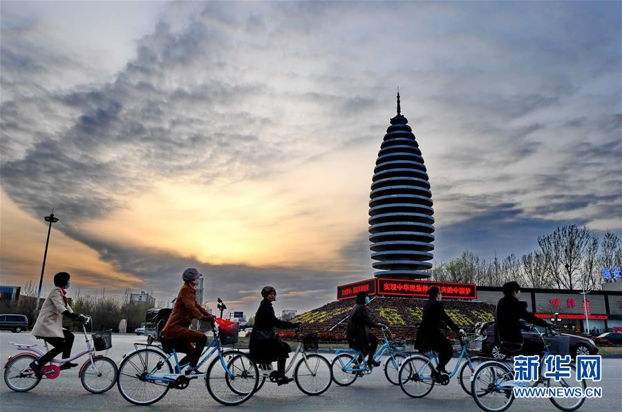 市民在河北雄安新区容城县县城道路上骑行(3月29日摄)。新华社记者 牟宇 摄