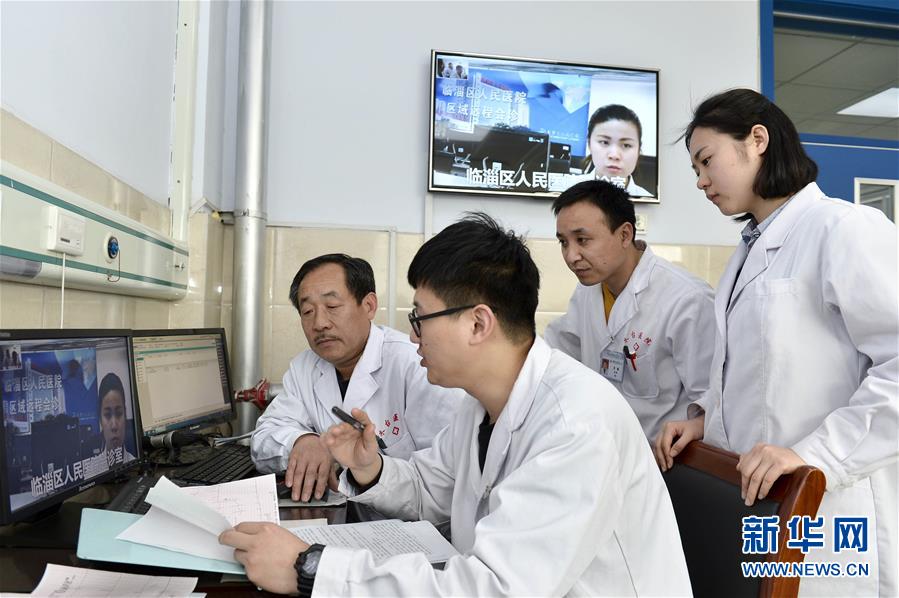 在山东省淄博市临淄区人民医院朱台分院影像远程会诊中心,医生通过远程会诊系统与临淄区人民医院的医生共同为患者诊断病情(2017年3月15日摄)。新华社记者 郭绪雷 摄