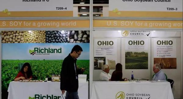 ▲此次中美贸易战波及美国大豆,图为在上海举行的国际大豆展览上,参观者走过美国大豆公司的展台。(美联社)