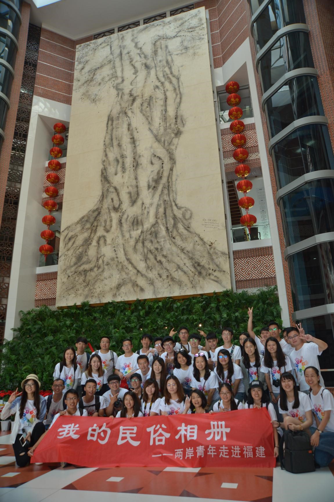 在中国闽台缘博物馆大厅一幅《同文 同种 同根生》的巨型壁画前,两岸青年合影留念,记下他们内心感知两岸血脉相亲、风俗相通的历史时刻。来自台湾中国文化大学的池欣庭表示,在讲解员生动的介绍下,她对海峡两岸的印象更加深刻,认识到两岸人民一家亲,两岸的文化是息息相关,水乳交融。