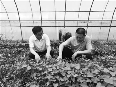 李庆刚(左一)在鹤壁市淇滨区上峪乡鹿厂村红薯育苗基地查看红薯长势情况。