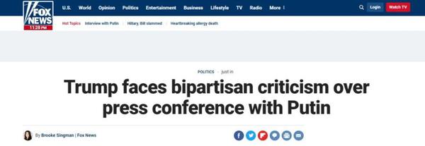 福克斯新闻:特朗普因与普京联合记者会承受来自两党的批评。