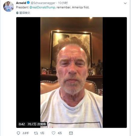 施瓦辛格推特上@特朗普:记住,美国优先。